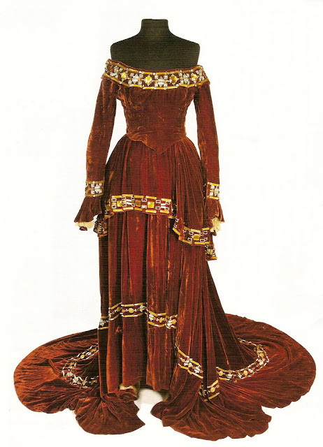 ...and here's the dress she's wearing, a "cognac silk velvet two-piece period gown heavily jeweled with gold and white stones." Talk about your Scarlet Empress! If you Ctrl-click on the picture to open it in a new tab, then "plus" it up to full size, you can see the exquisite detail in the jeweling, which probably went all but unnoticed by audiences at the time. (You can, alas, also see that time has visited its ravages on the gown -- mostly, no doubt, between 1945 and '71, when Debbie acquired it from 20th Century Fox.) Bidding on this one started at $3,000 and it sold for $7,000 plus another $1,610 for the house commission and sales taxes.